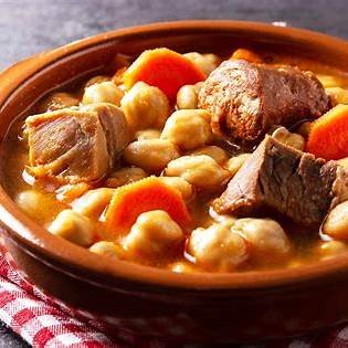 - Sirve caliente, tradicionalmente en tres vuelcos: primero la sopa con fideos, luego los garbanzos y las verduras, y finalmente las carnes.