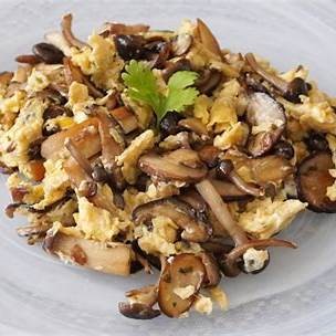- Vierte los huevos batidos sobre las setas en la sartén.