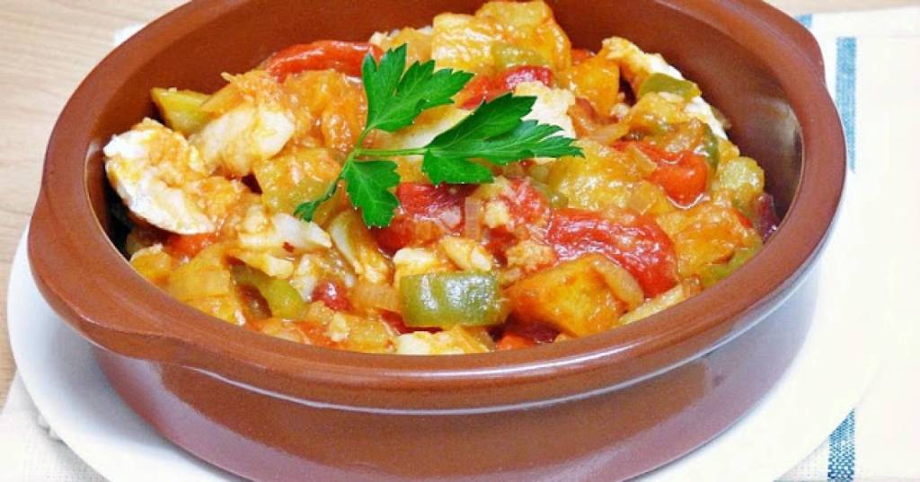 - Vierte el sofrito de patatas, cebolla, tomate y pimientos sobre el bacalao en la cazuela de barro.
