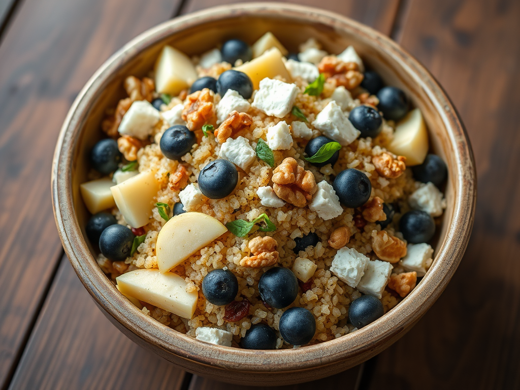 - En un bowl grande, combina la quinoa tibia con la mezcla de manzana y arándanos.