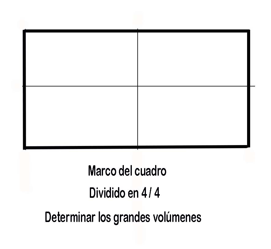 Este marco nos sirve para determinar donde están ubicados los grandes volúmenes de lo que vamos a dibujar. Por ejemplo si es un paisaje donde está ubicada la cumbre de la montaña, donde empiezan los árboles, donde empieza el río o donde el campanario de la iglesia etc… Sencillamente lo marcamos. Aunque sea con una simple marca.