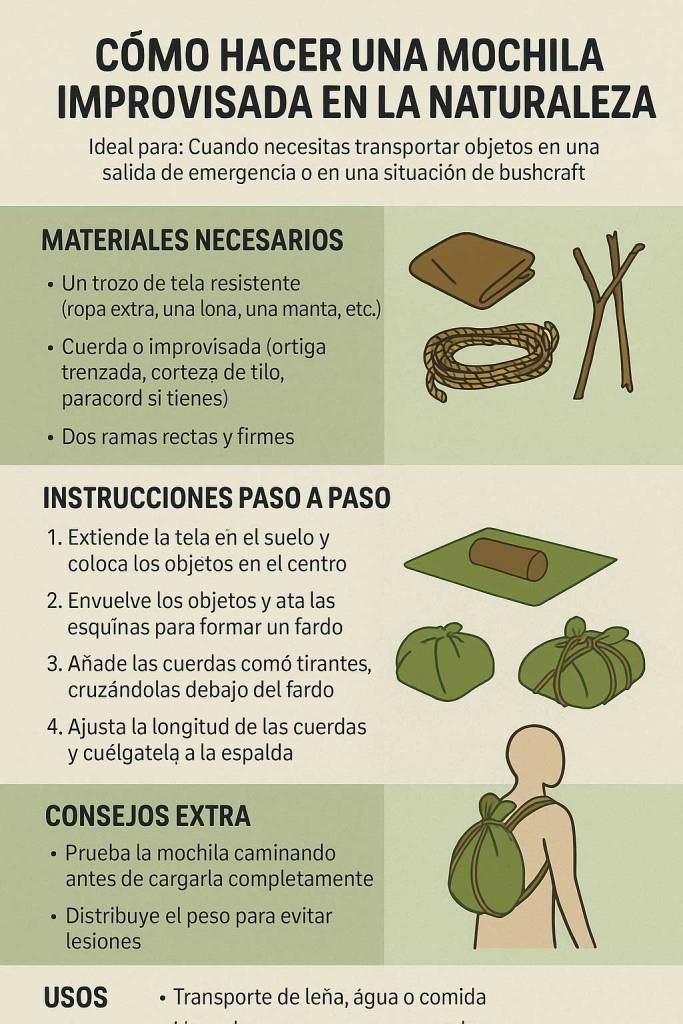 Ideal para: Cuando necesitas transportar objetos en una salida de emergencia o en una situación de bushcraft sin mochila convencional.