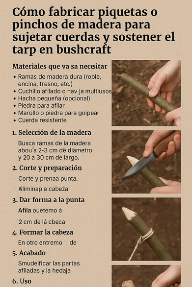 Fabricar tus propios clavos o piquetas de madera es una habilidad esencial en bushcraft, ideal para fijar cuerdas y asegurar un tarp en la naturaleza. Aquí te explico paso a paso cómo hacerlo, junto con consejos y errores frecuentes para que te salga perfecto.