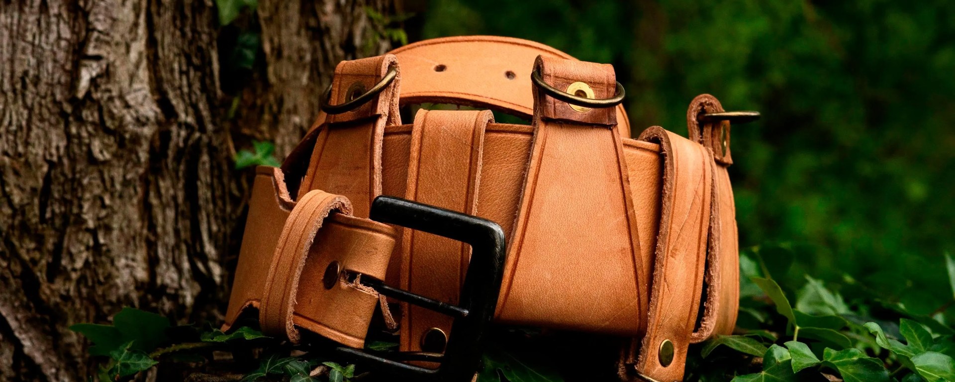 Cinturón de carga para bushcraft con tirantes hecho a mano con cuero español de curtido vegetal de 3 mm.