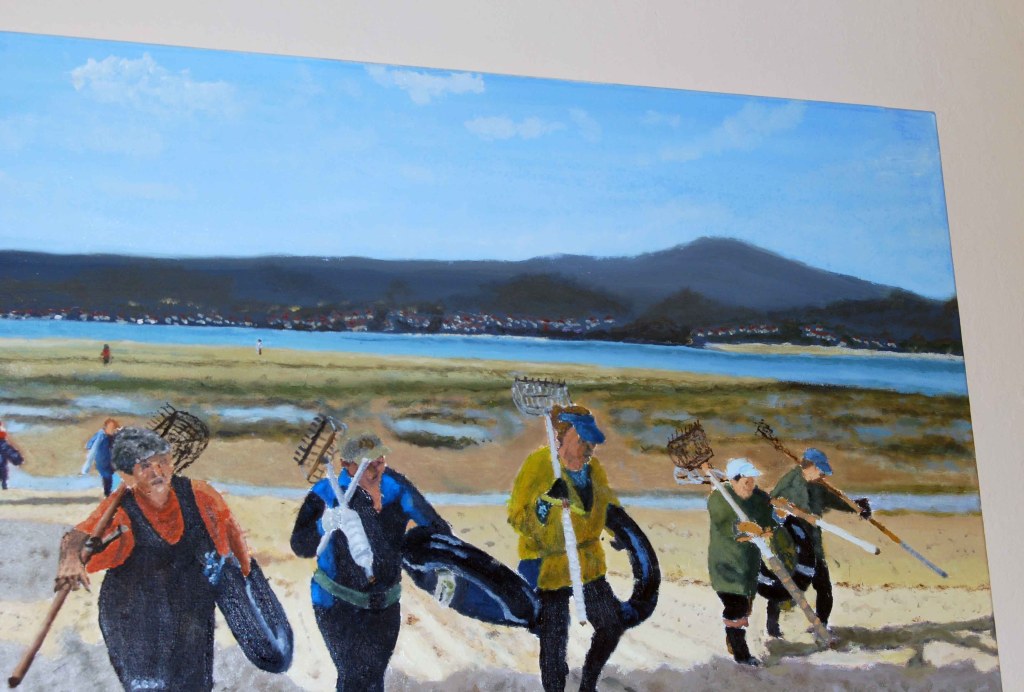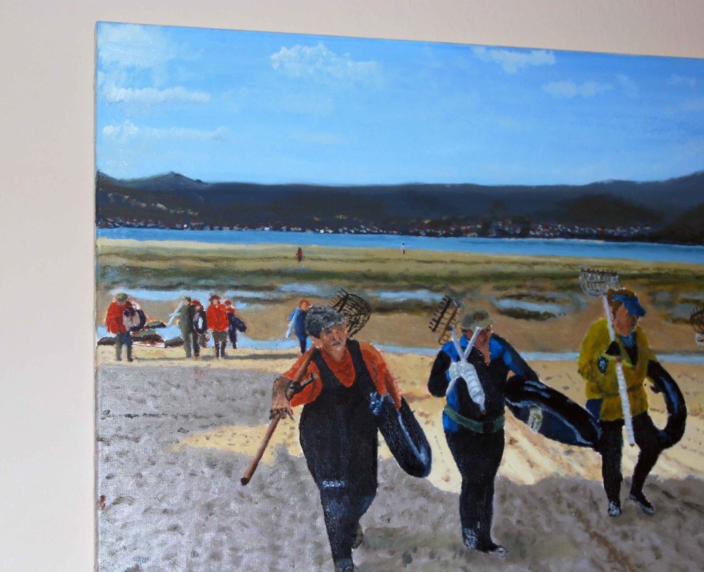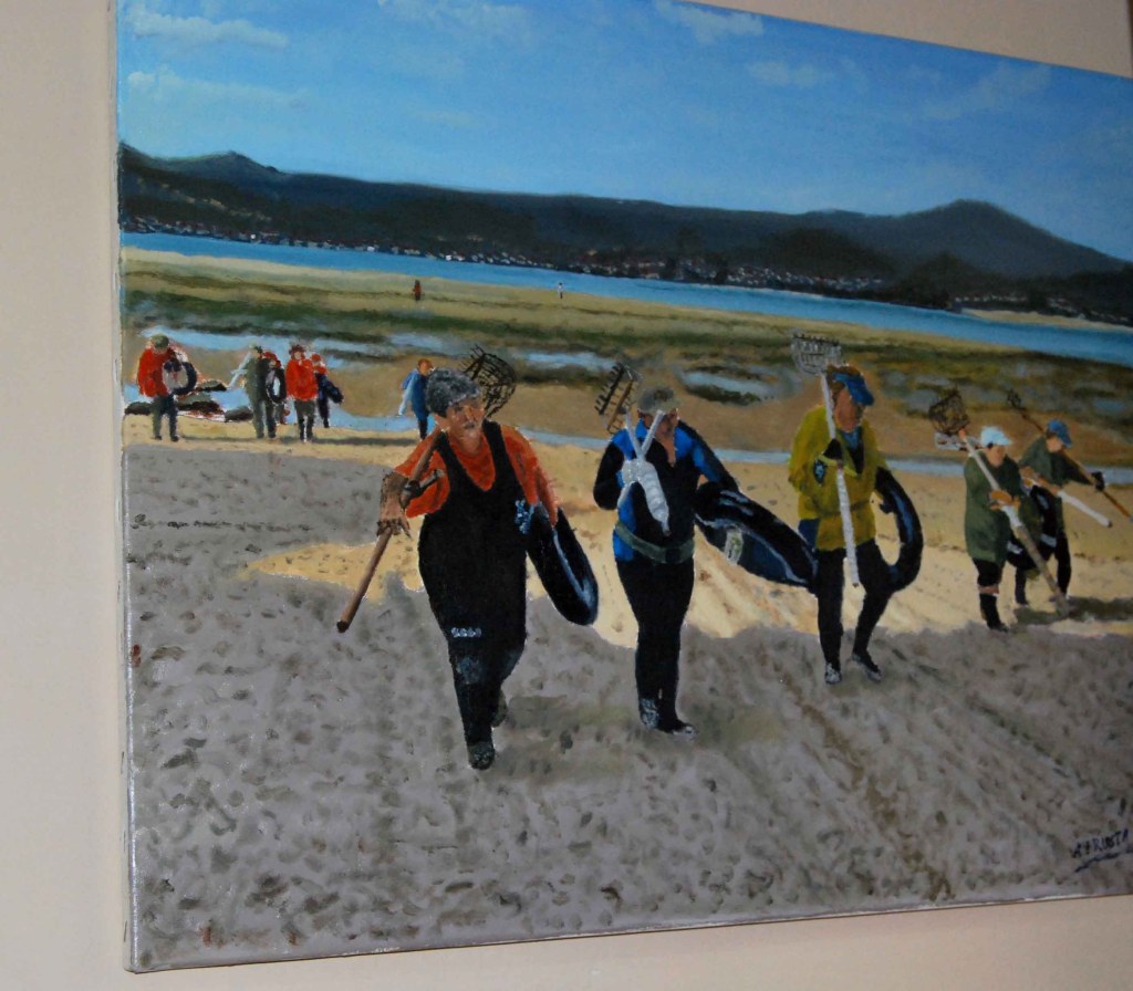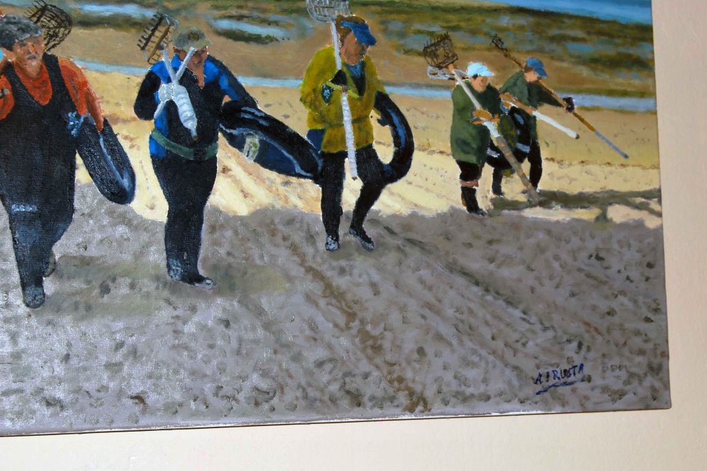 Este cuadro representa una escena de trabajo en la costa norte de España, con un enfoque muy humano y costumbrista. El autor opta por una estética realista, aunque sin caer en el hiperrealismo, con un uso del color que transmite perfectamente la atmósfera húmeda y viva del norte.