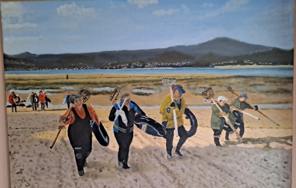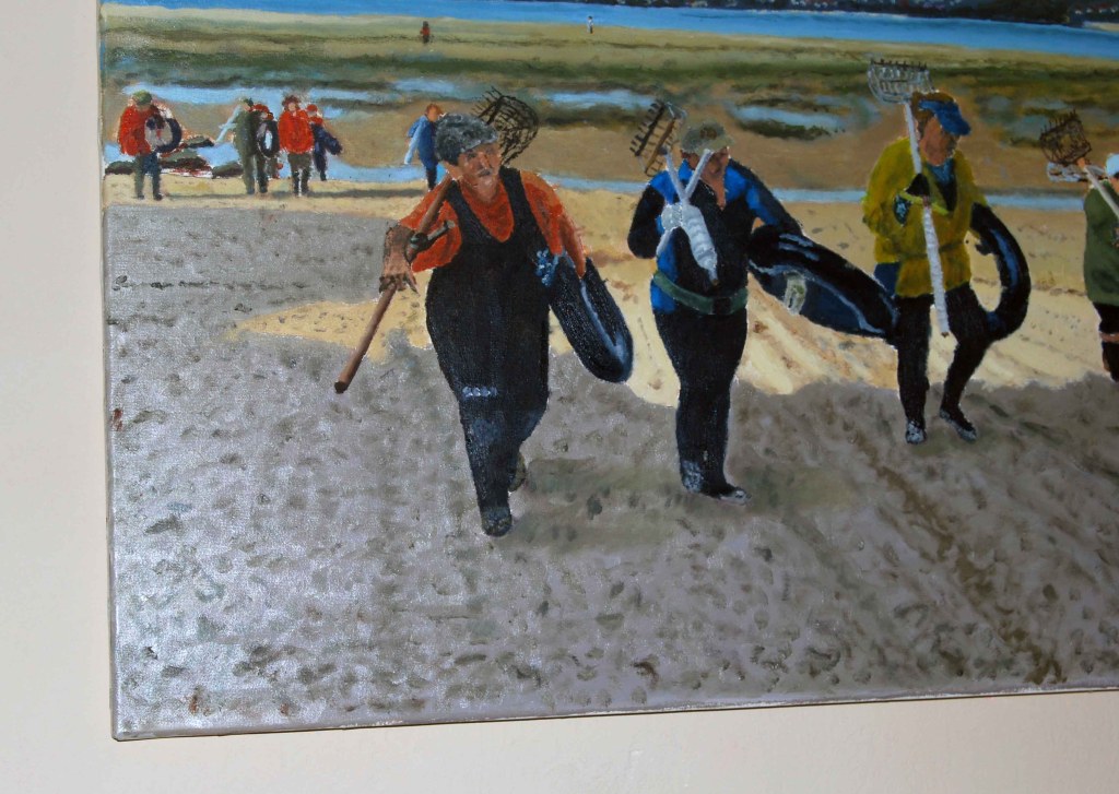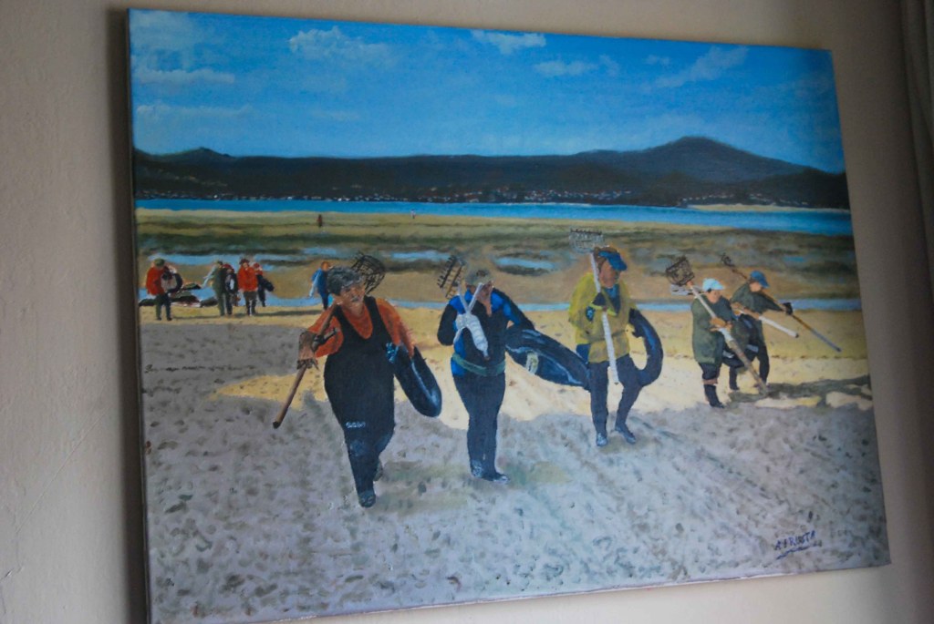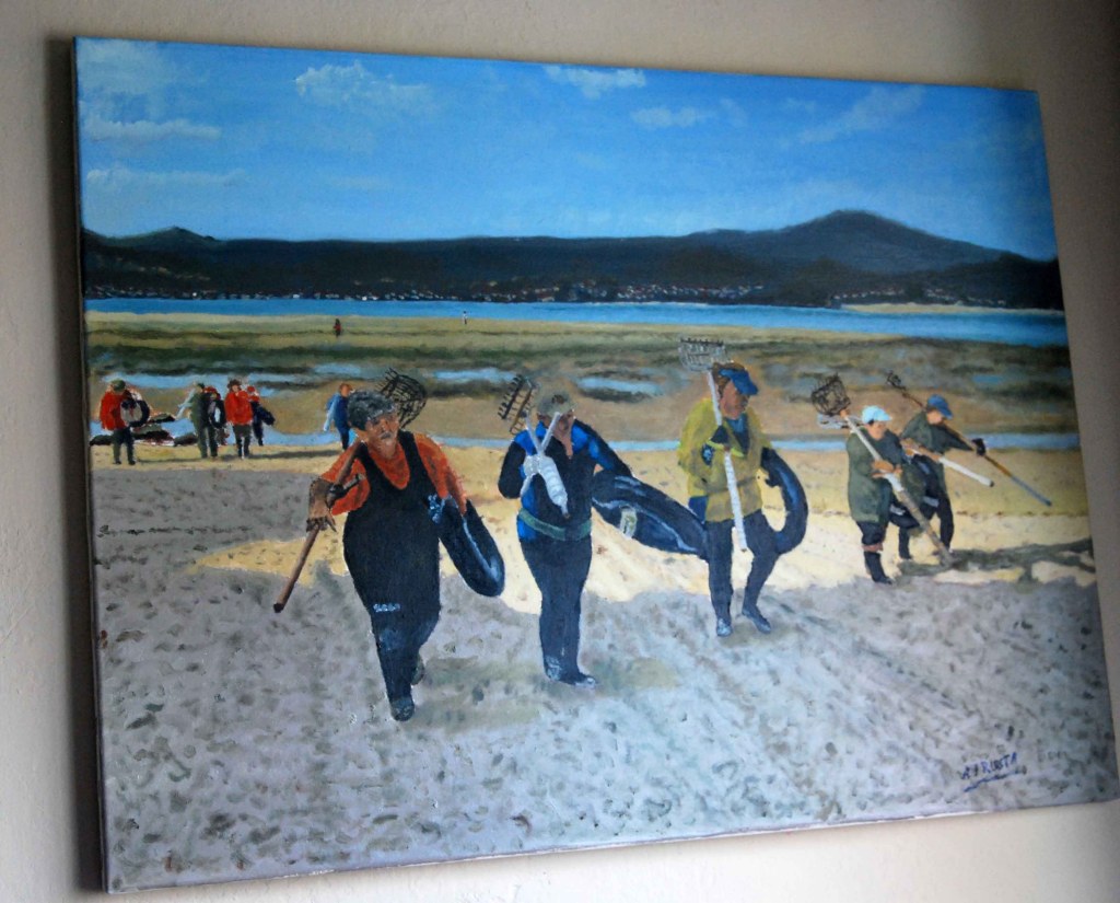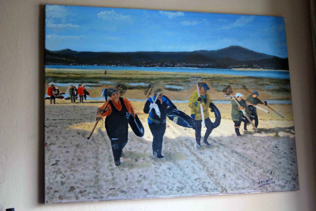 Este cuadro representa una escena de trabajo en la costa norte de España, con un enfoque muy humano y costumbrista. El autor opta por una estética realista, aunque sin caer en el hiperrealismo, con un uso del color que transmite perfectamente la atmósfera húmeda y viva del norte.
