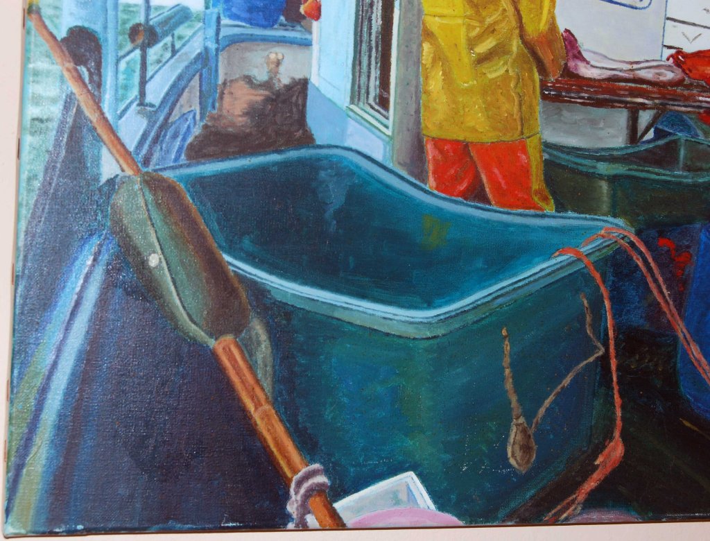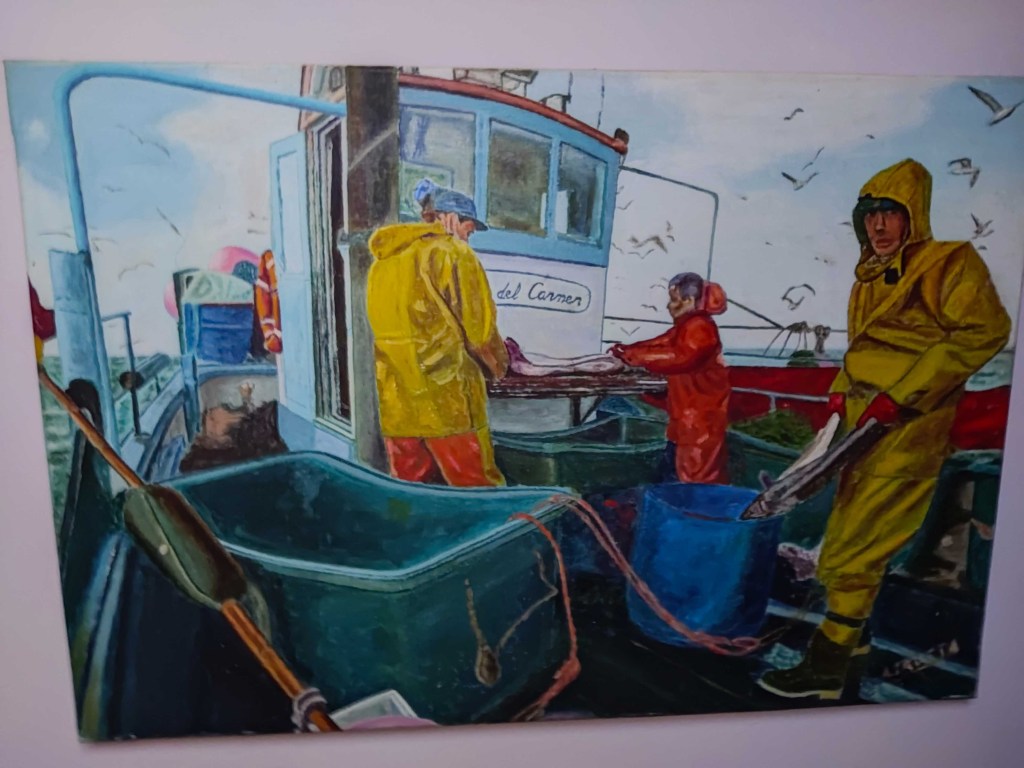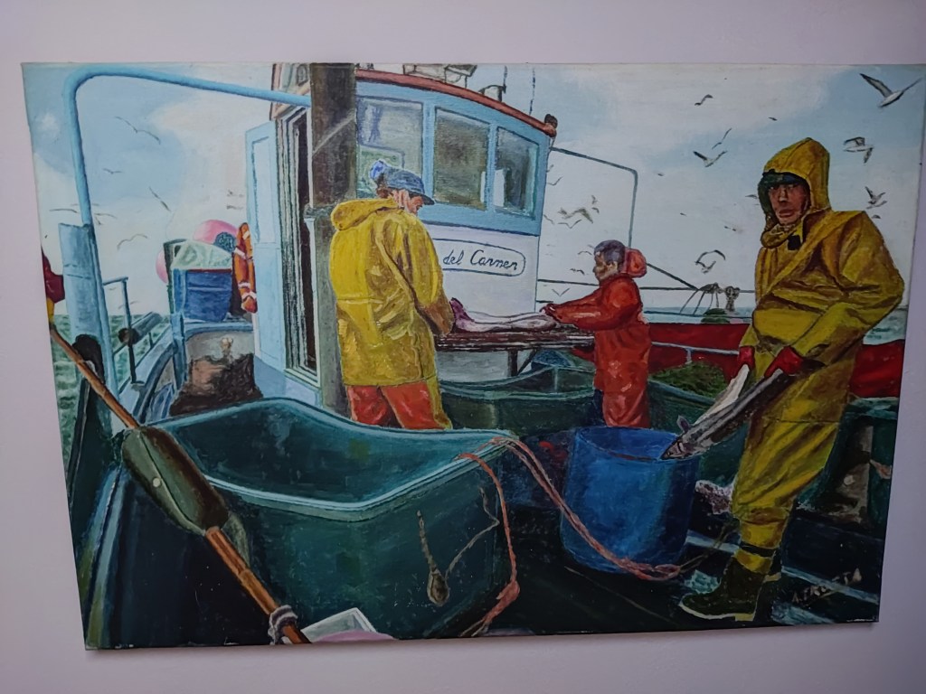 - Color y Luz: Los colores son intensos y contrastados. Destacan los amarillos vibrantes de los chubasqueros de dos de los pescadores, que contrastan con el rojo del tercer pescador y los tonos azules y verdes del barco y el mar. El cielo grisáceo, salpicado de gaviotas, sugiere un día de faena en alta mar, posiblemente nublado pero con suficiente luz para iluminar la escena. El tratamiento de las texturas en la ropa de los pescadores y en las superficies del barco es notable.