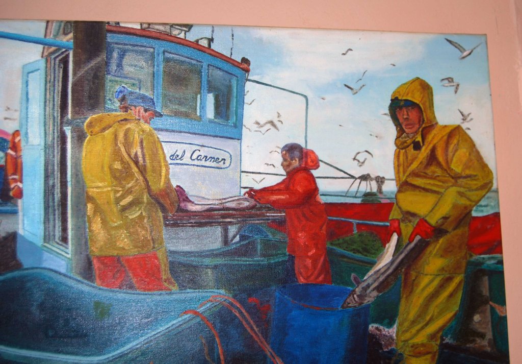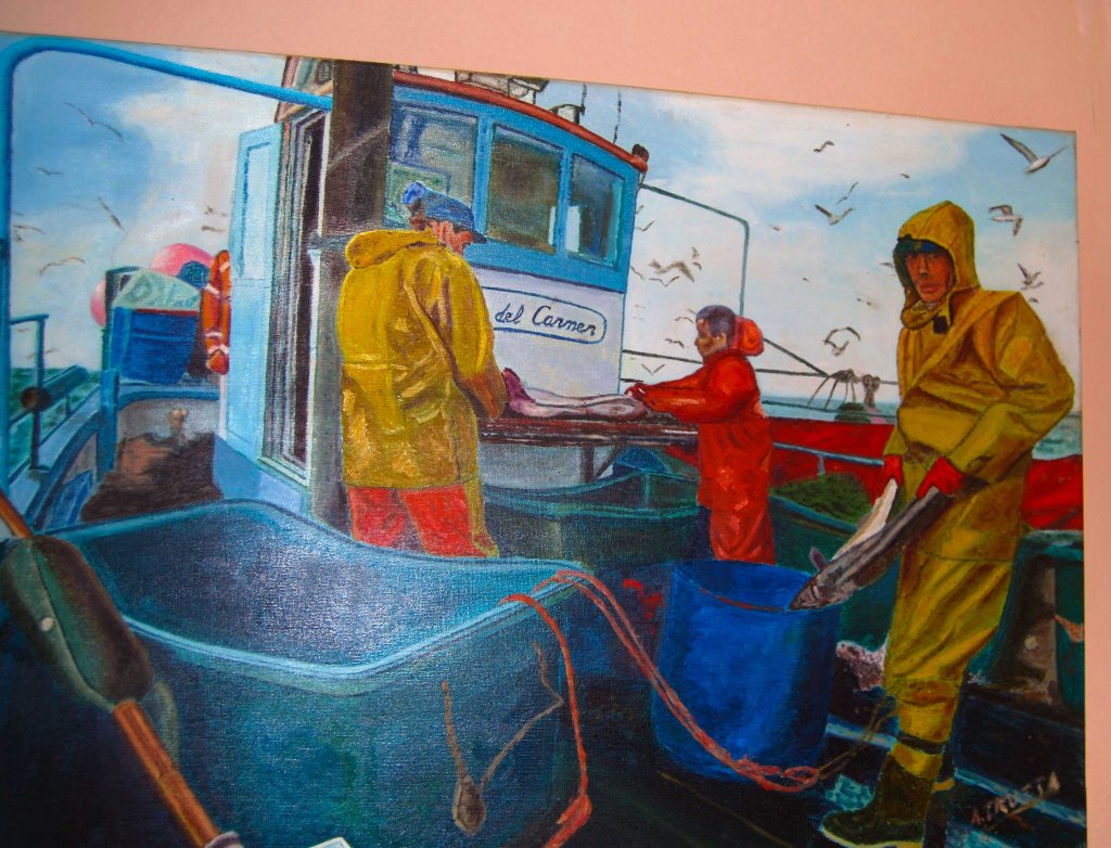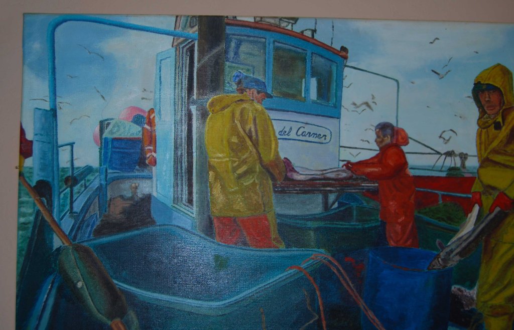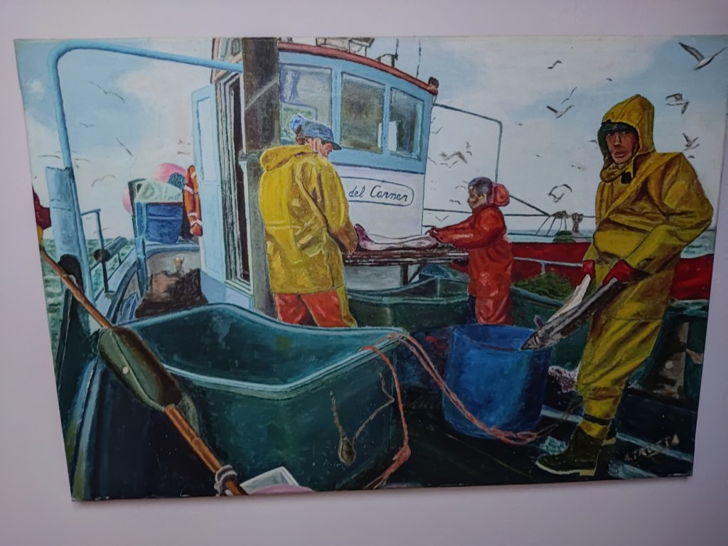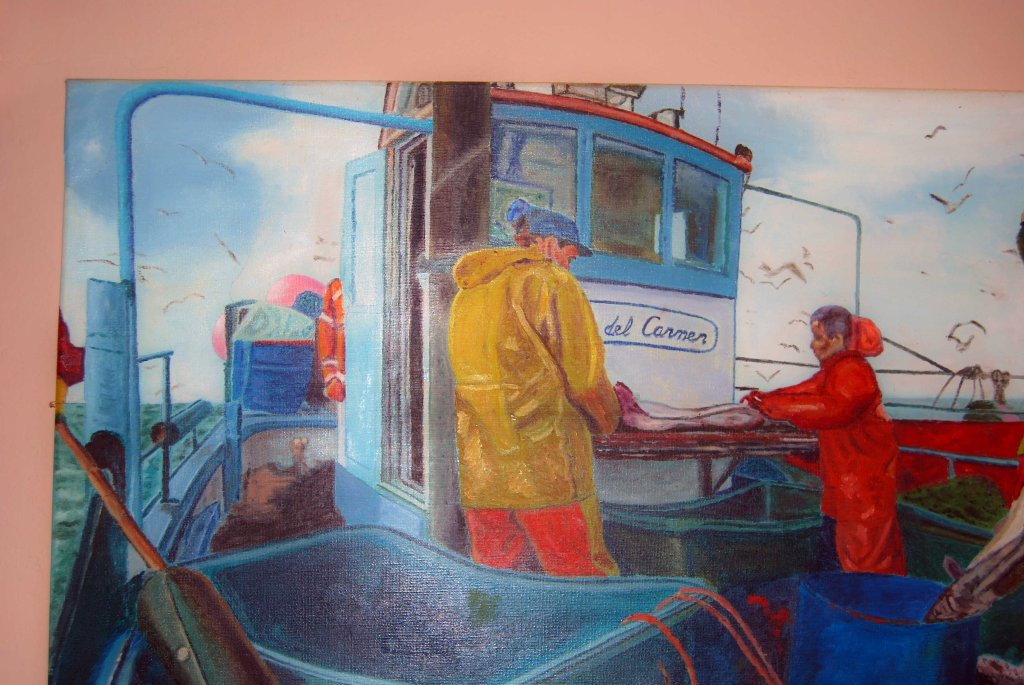 - Fecha y Lugar: Pintado en 2012 en Asturias. La temática marina y pesquera encaja perfectamente con la tradición y el paisaje de Asturias, una región con una fuerte identidad ligada al mar. Este detalle añade autenticidad a la representación de la faena pesquera. El nombre del barco «del Carmen» es un detalle encantador que añade un toque personal y local a la obra.