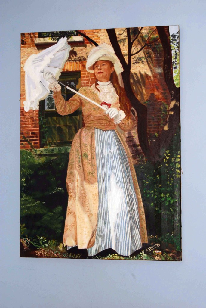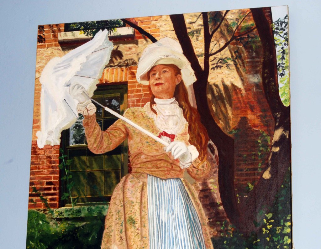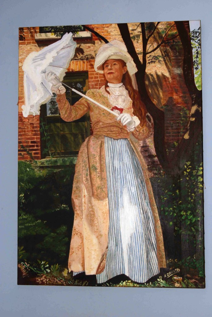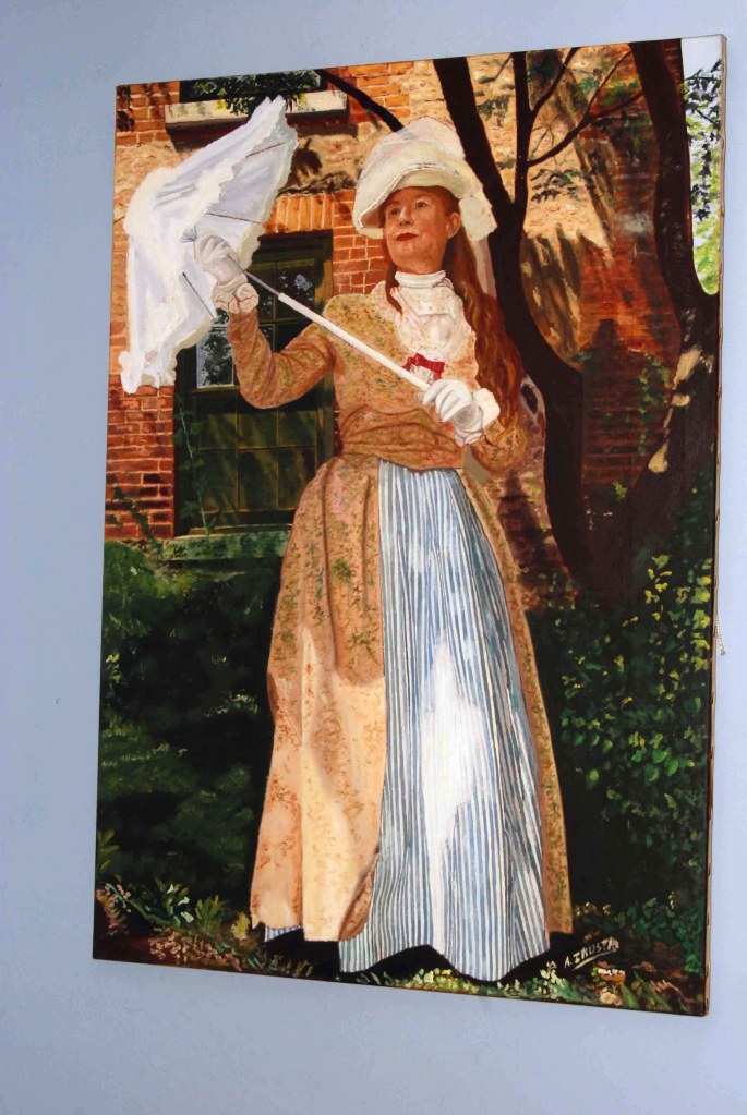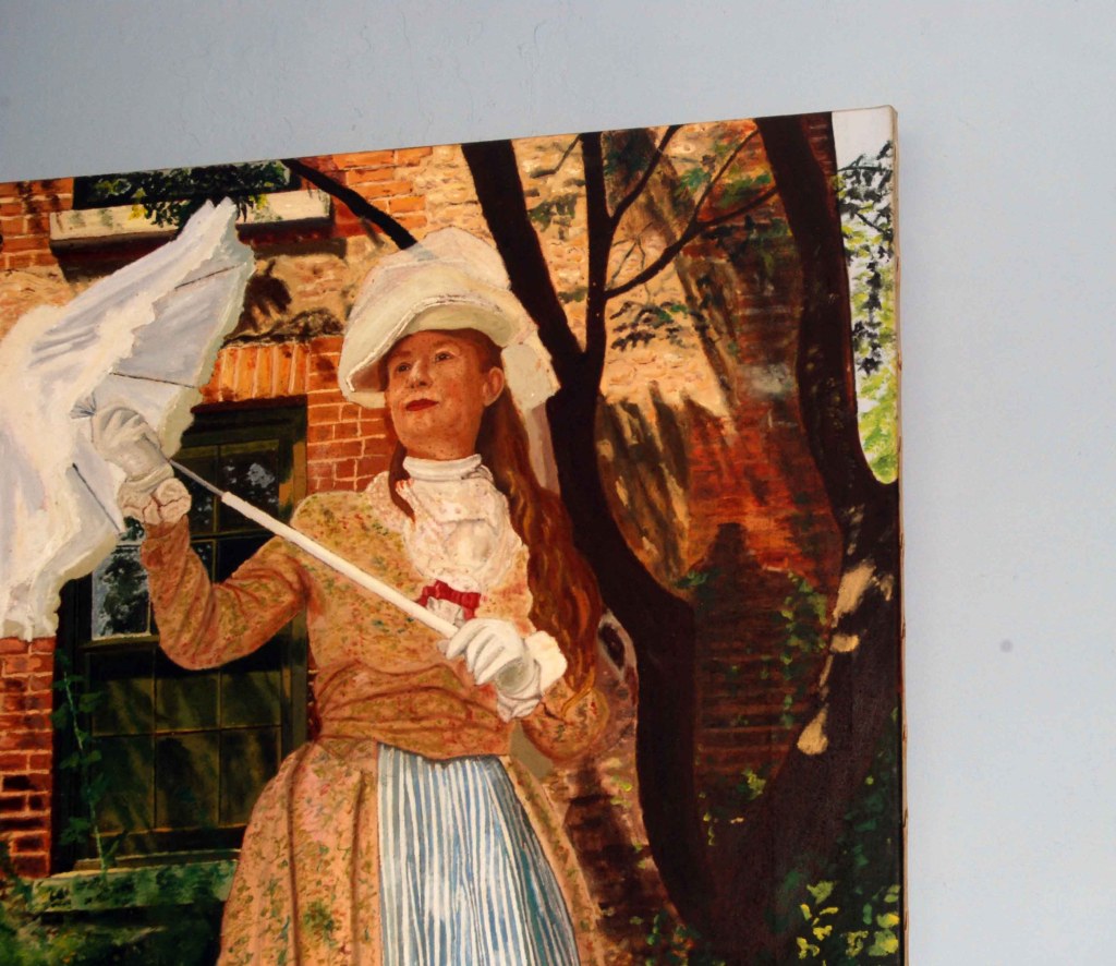 La obra presenta a una dama vestida con ropajes de época, sosteniendo una delicada sombrilla blanca que la protege del sol. La vestimenta, con su falda de rayas verticales y una chaqueta elaboradamente estampada, así como los volantes y guantes, denota una atención meticulosa al detalle en la representación de la moda de antaño. El sombrero prominente añade un toque de distinción a su figura.