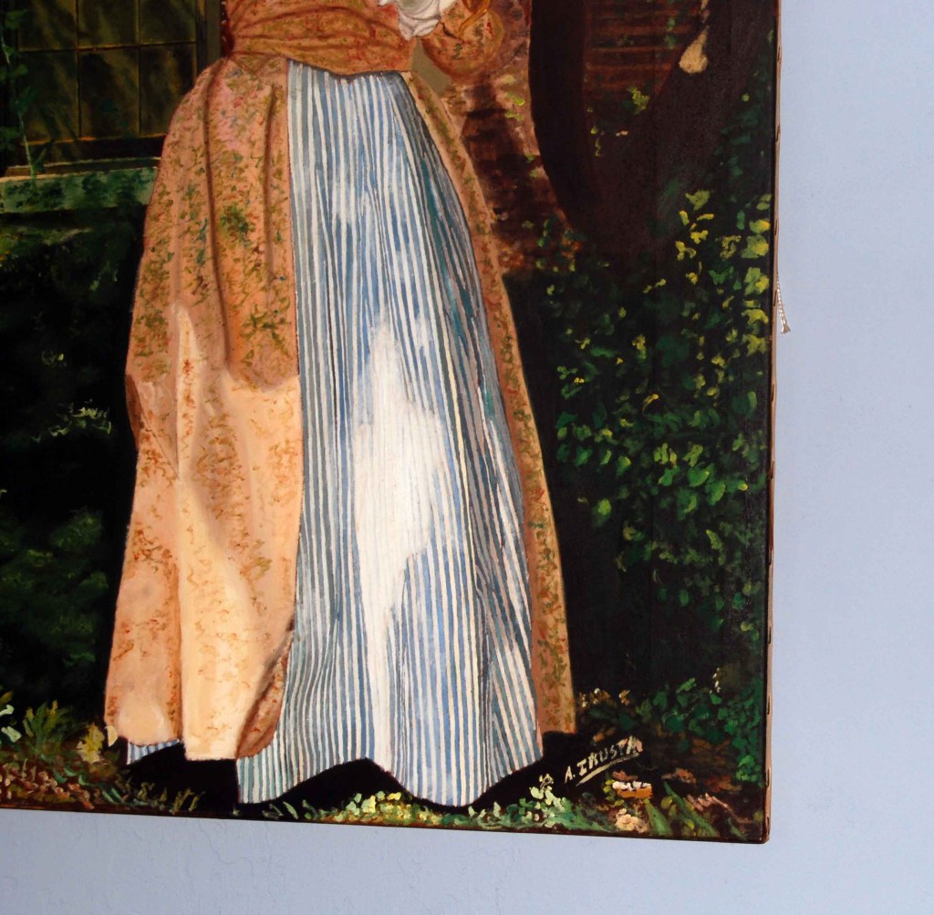 El fondo del cuadro, con la fachada de ladrillo de un edificio y la exuberante vegetación, crea un entorno que evoca un jardín o un paseo campestre, añadiendo profundidad y atmósfera a la escena. La luz natural ilumina suavemente la figura de la dama, resaltando las texturas de su atuendo y la serenidad de su expresión.