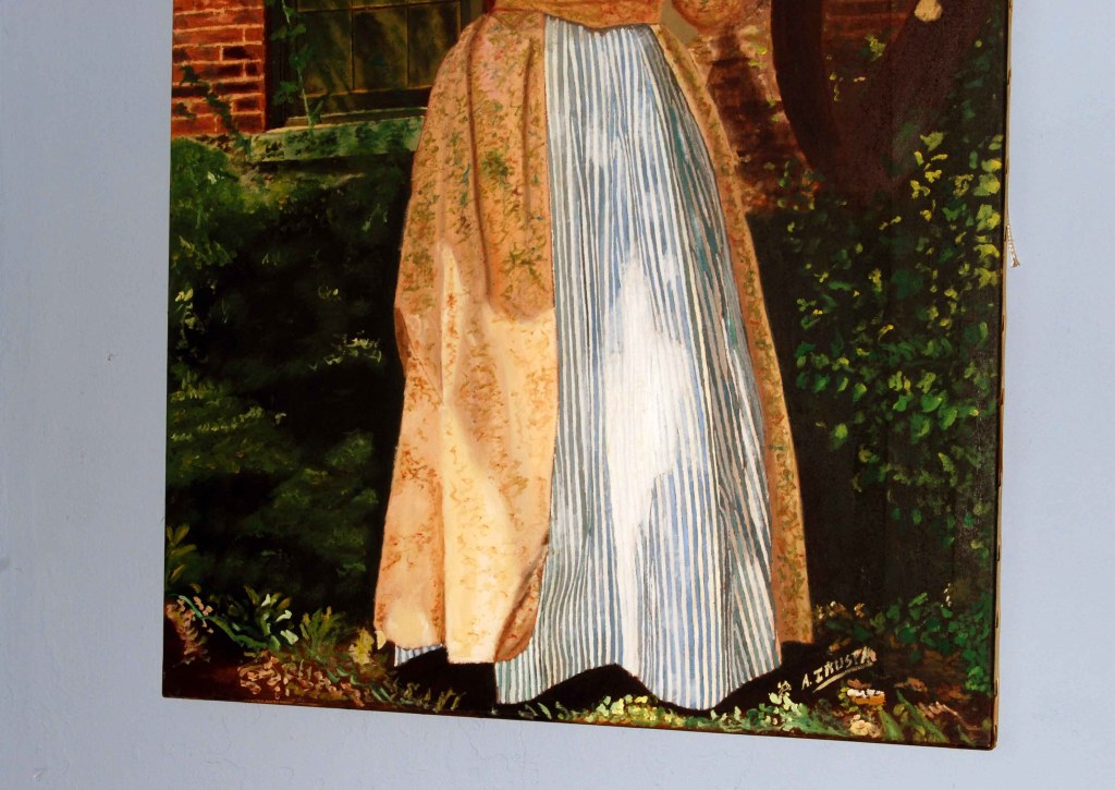 El estilo de Irusta se caracteriza por su realismo y la riqueza cromática, que se aprecia en la viveza de los verdes del follaje y los tonos cálidos de la vestimenta y el ladrillo. «Dama con Sombrilla» no es solo un retrato; es una ventana a otro tiempo, una invitación a imaginar las historias que pudo vivir esta elegante figura. La obra irradia una calma y una dignidad que invitan a la contemplación.