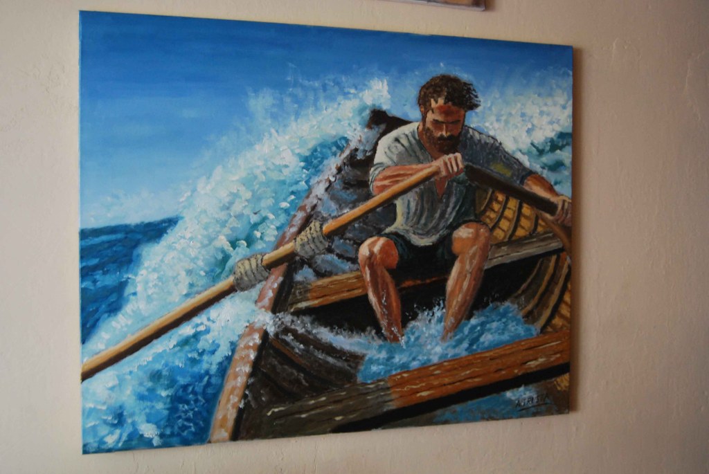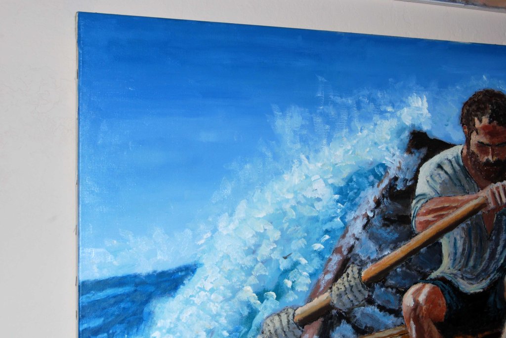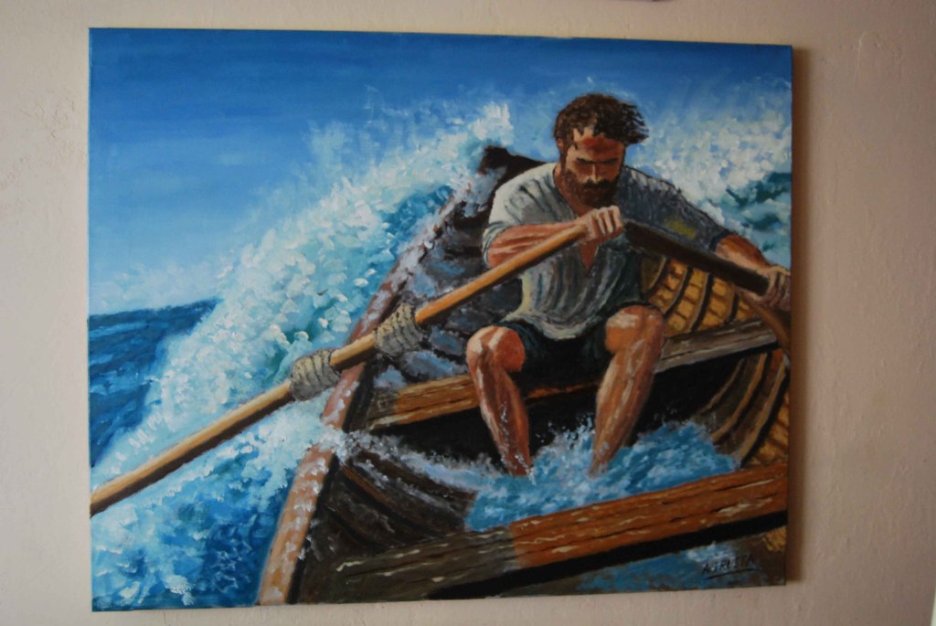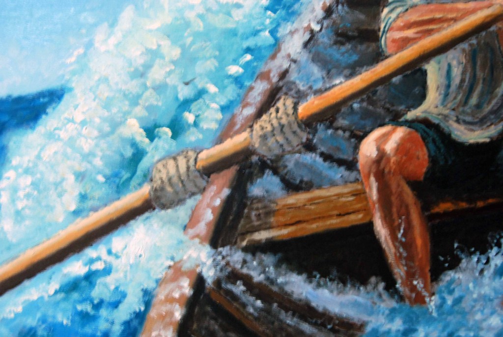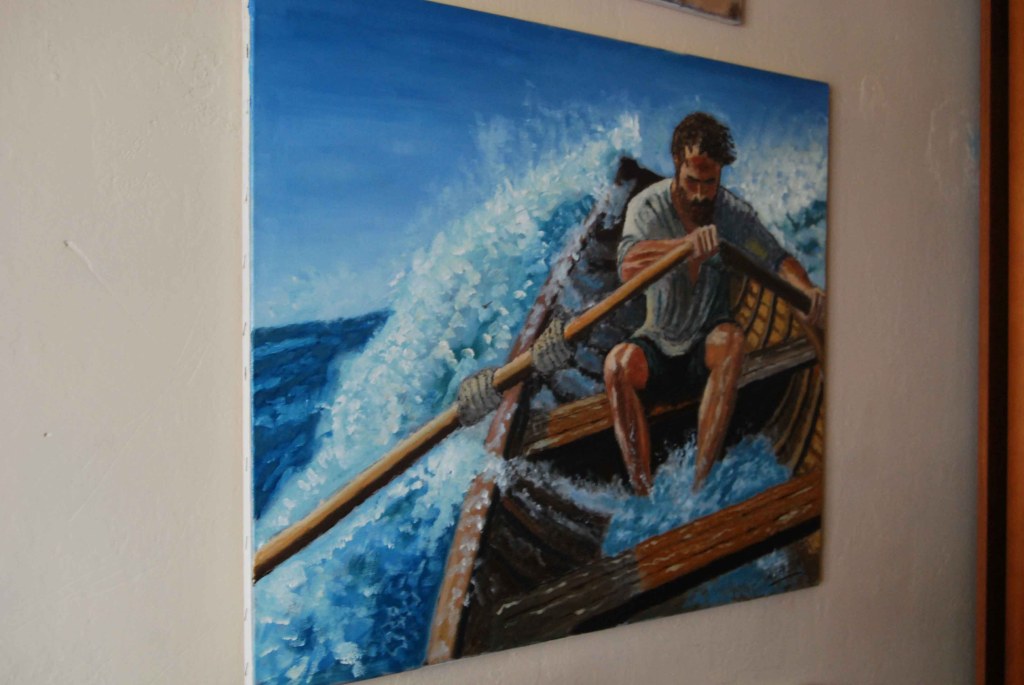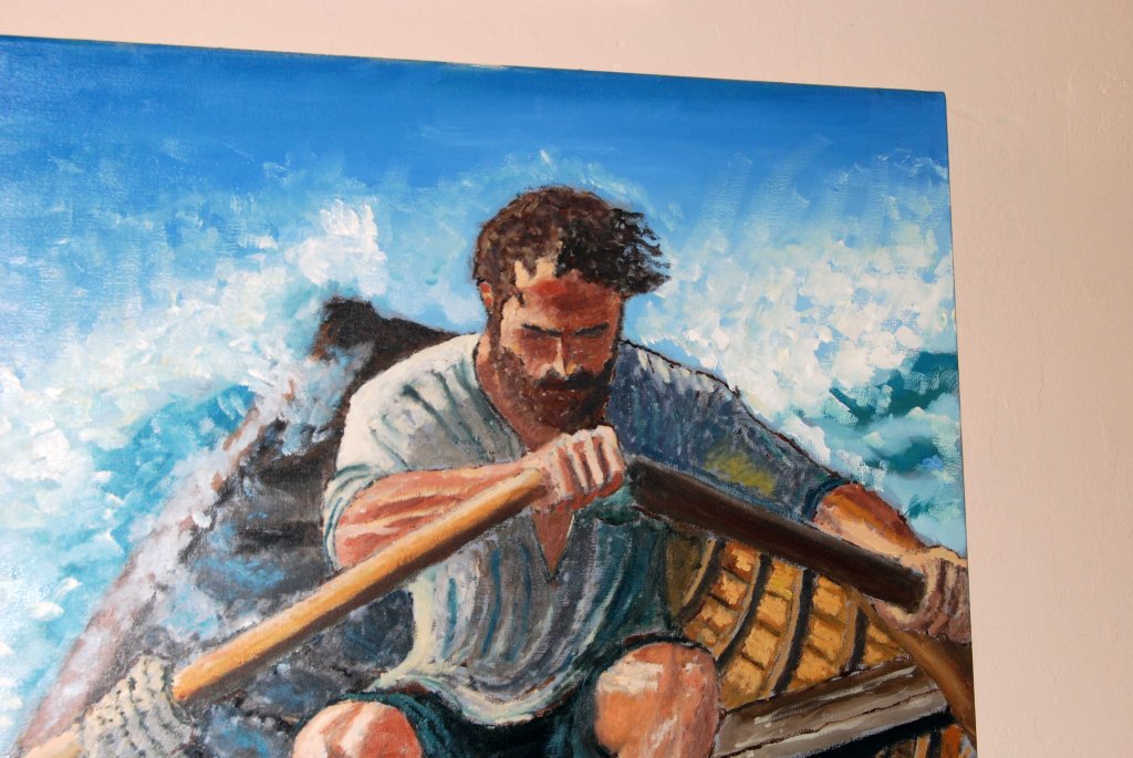 - Técnica destacada: El uso del óleo permite texturas ricas en las olas y el rostro del remero, añadiendo profundidad emocional.