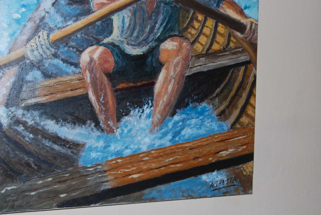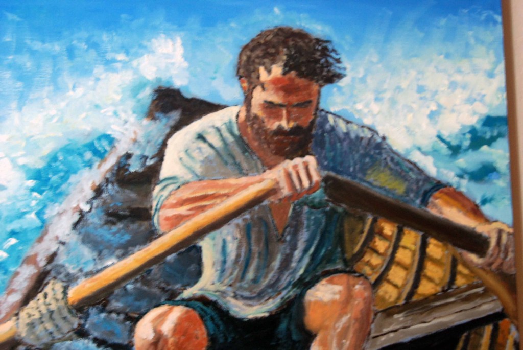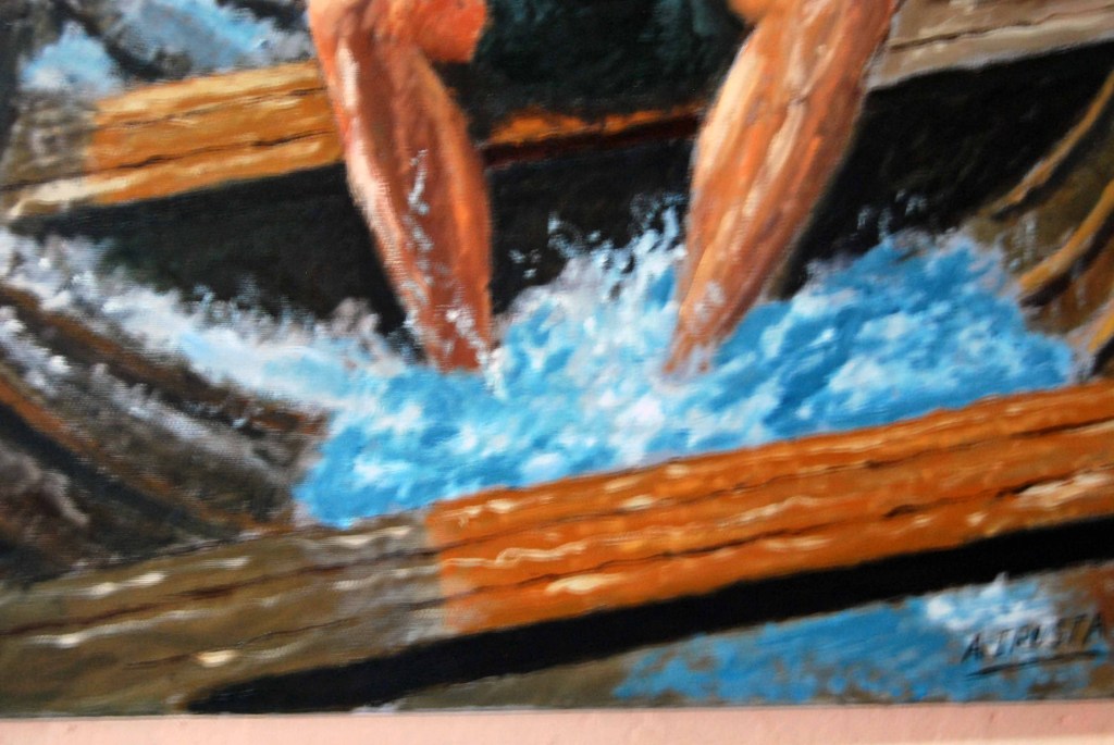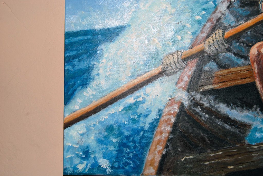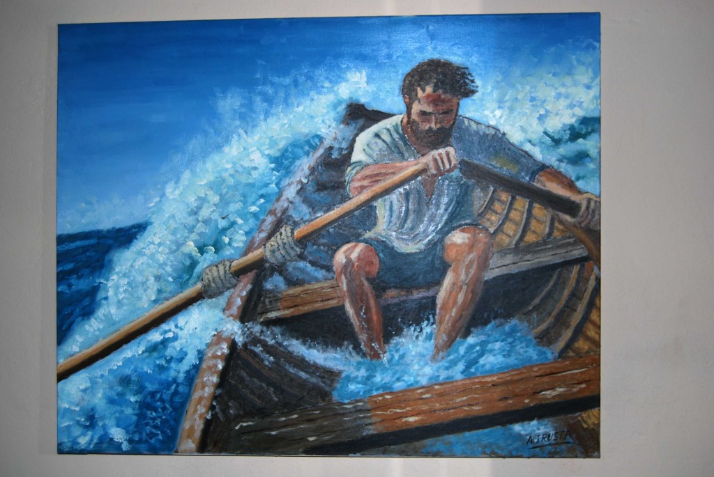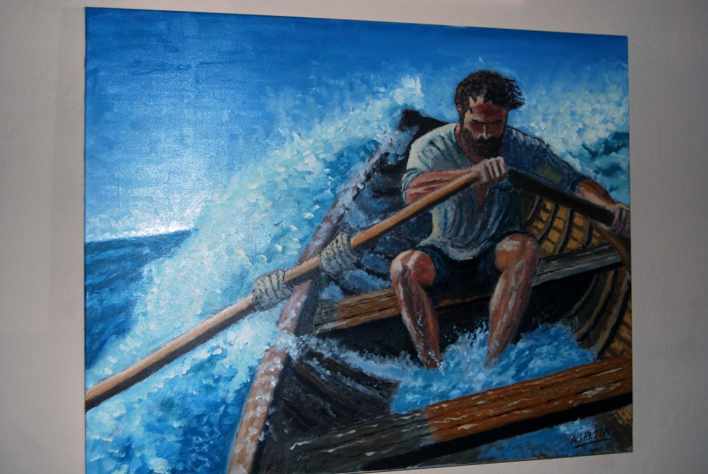 - Técnica destacada: El uso del óleo permite texturas ricas en las olas y el rostro del remero, añadiendo profundidad emocional.