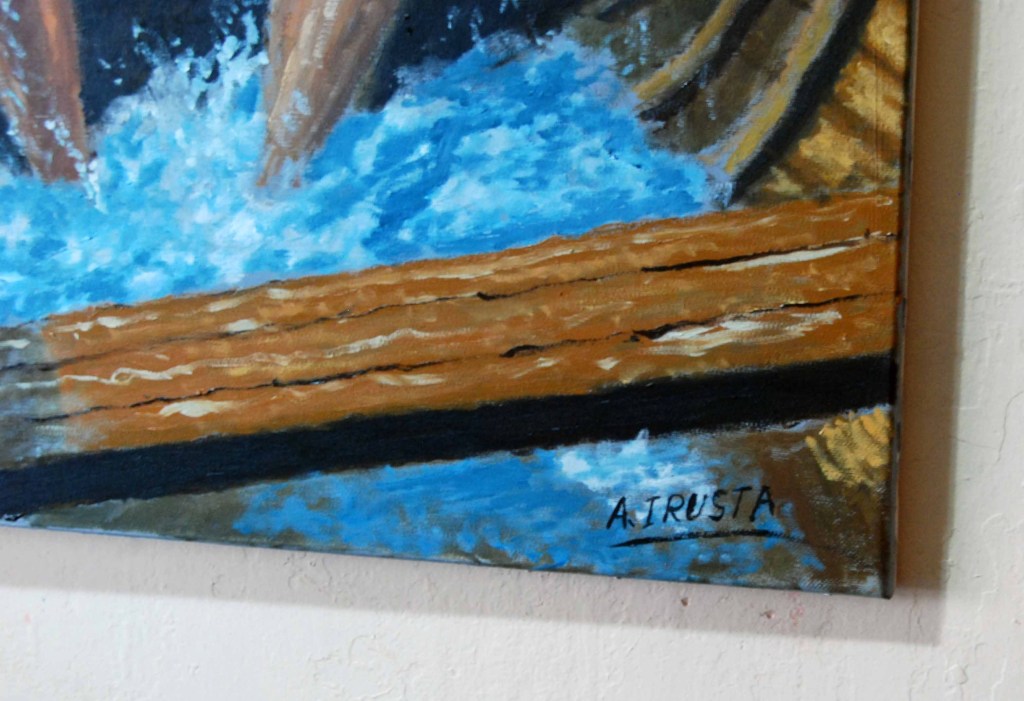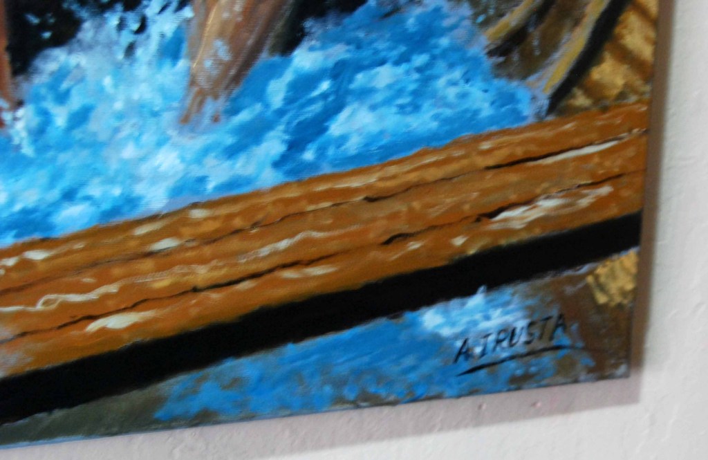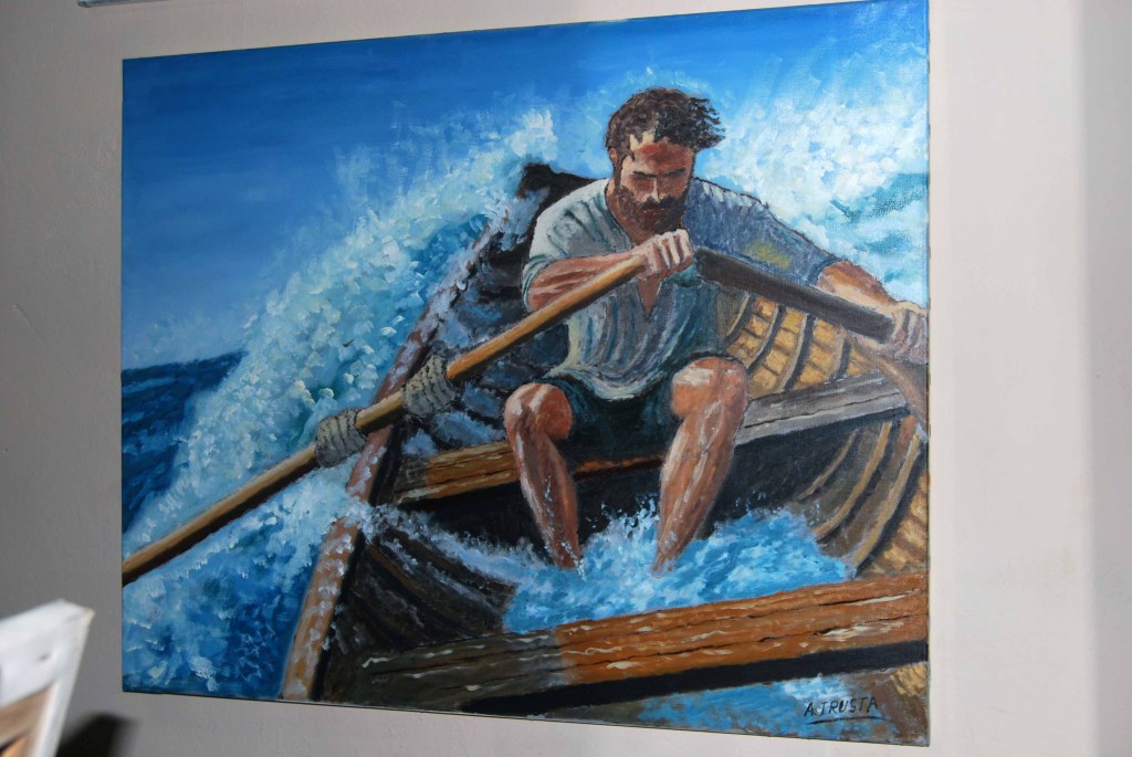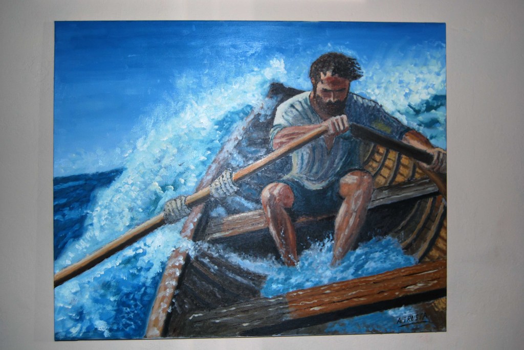 Esta obra de Agustín Irusta es un testimonio visual de la lucha humana frente a la adversidad. Con una paleta dramática y pinceladas cargadas de movimiento, el artista captura el instante en que un remero desafía un mar embravecido, transmitiendo una potente narrativa de esfuerzo y resiliencia.