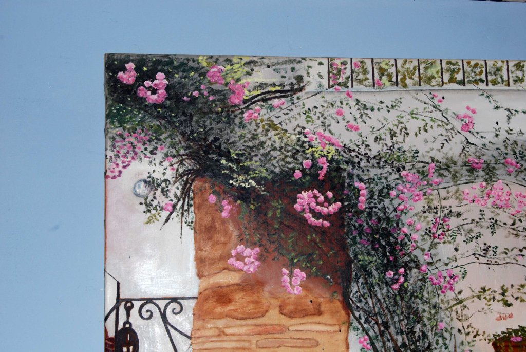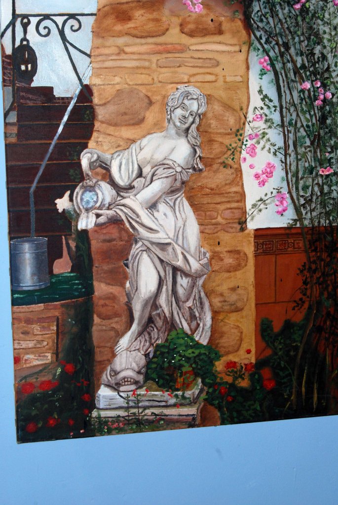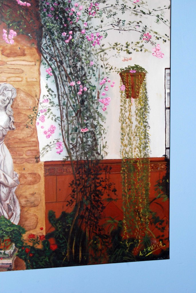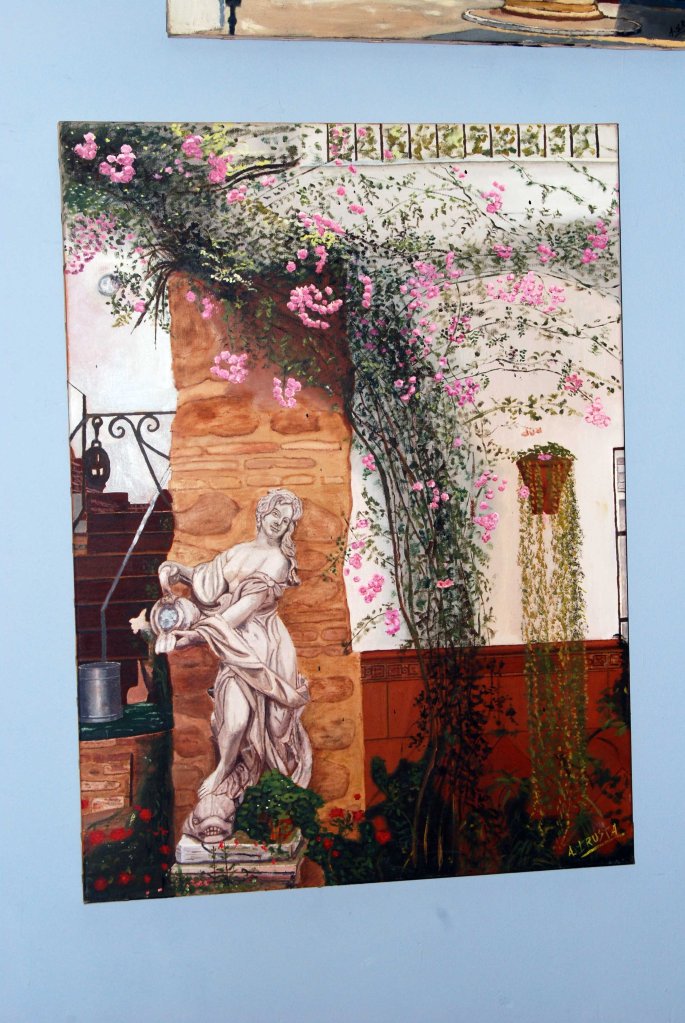 En esta obra, Agustín Irusta nos transporta a un rincón de Andalucía rebosante de serenidad y belleza. La escena muestra un patio tradicional donde la vegetación trepa con libertad, abrazando muros cálidos de piedra y cal, mientras una escultura clásica parece cobrar vida entre los juegos de luz y sombra. El realismo minucioso y la delicadeza en la ejecución hacen de esta pintura un homenaje al alma arquitectónica y botánica del sur español. El equilibrio entre naturaleza y arte, entre lo estático y lo orgánico, se convierte en el verdadero protagonista del lienzo.