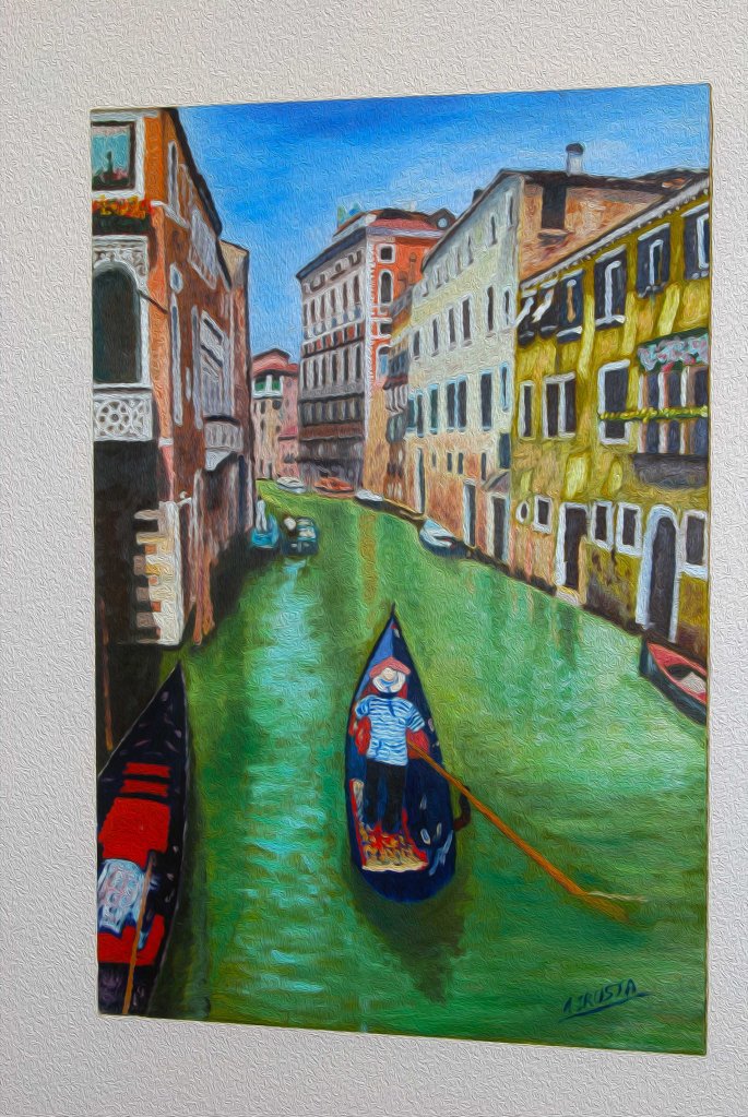 La composición nos invita a un recorrido visual por un estrecho canal, flanqueado por las características fachadas de los edificios venecianos, bañadas por la cálida luz del sol. En primer plano, una góndola con su gondolero ataviado con la tradicional camiseta a rayas, se desliza suavemente sobre las aguas de un verde intenso, reflejando el cielo y las edificaciones. La presencia de otras embarcaciones en la distancia añade profundidad y dinamismo a la escena, mientras que los detalles arquitectónicos de los palazzi, con sus balcones y ventanas, sugieren la rica historia de la ciudad.