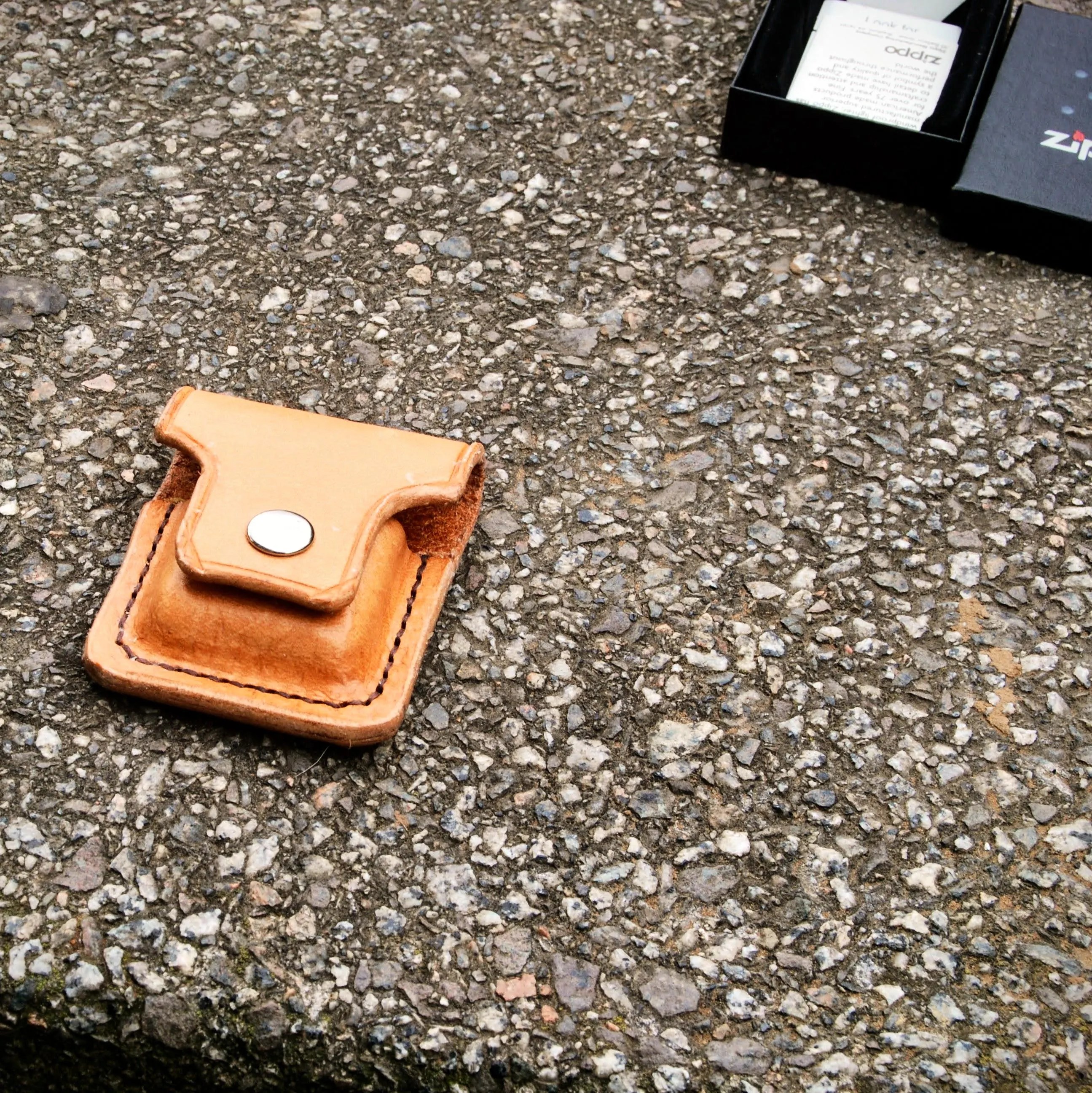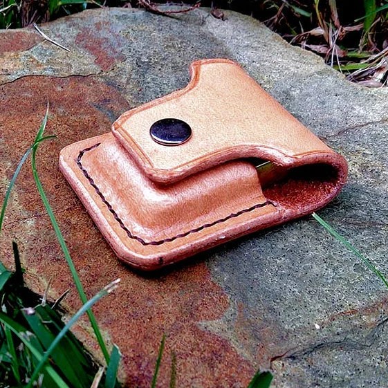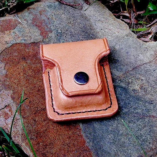 Funda para encendedor. Hecha con cuero de curtición vegetal de aproximadamente 3,5 mm de grosor y cosida a mano con hilo encerado. Acabada con grasa.