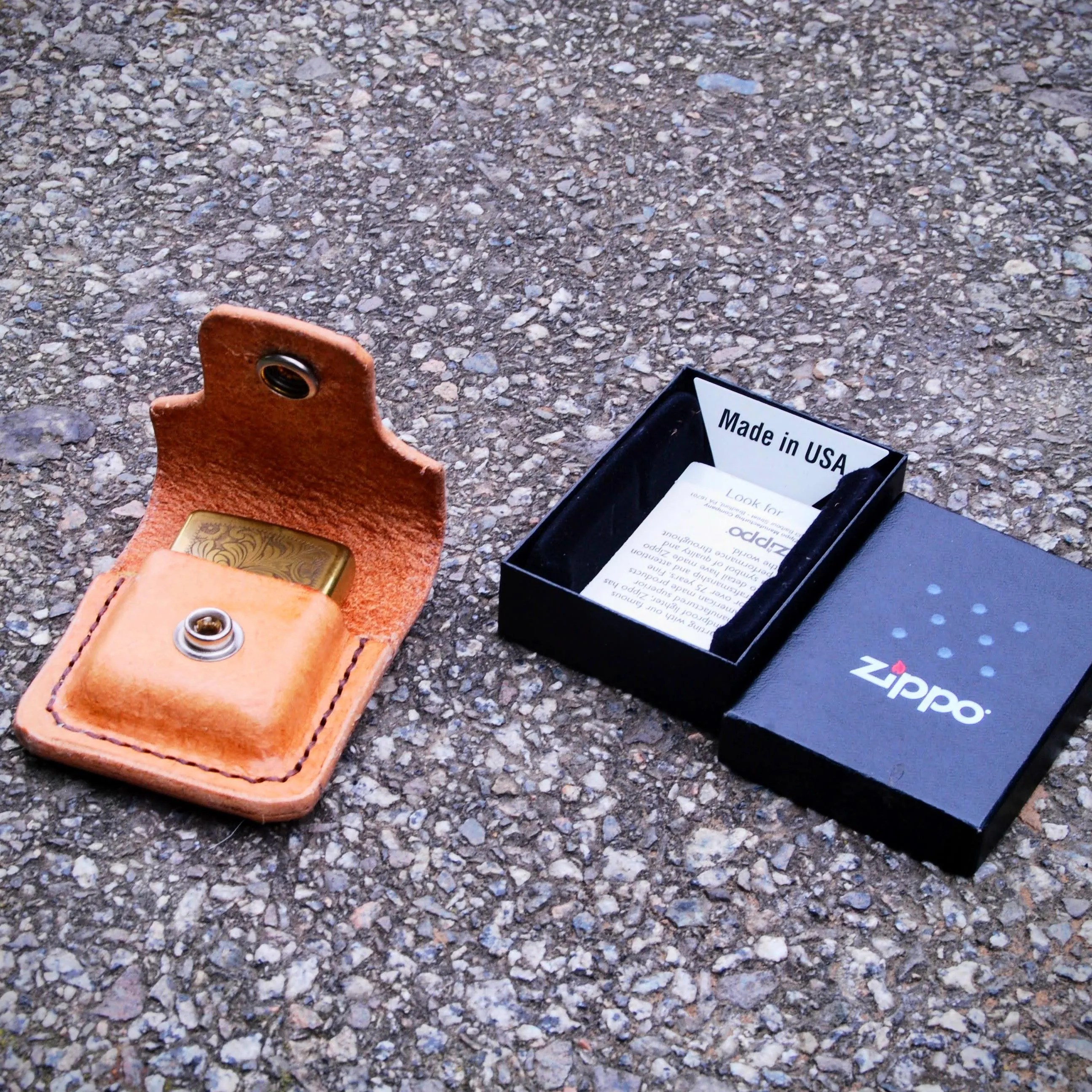 Funda para encendedor de cuero español cosida a mano con hilo encerado.